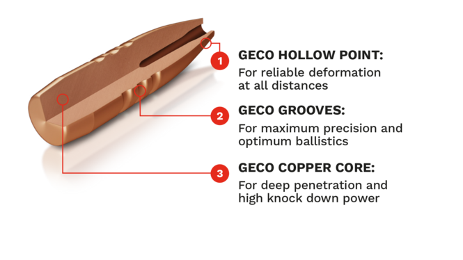 Sichere Deformation auf alle Entfernungen dank Hohlspitzkonstruktion Hohe Eigenpräzision und gute Wildbretverwertung Maximale Tiefenwirkung und geringe Fluchtstrecken dank GECO COPPER CORE