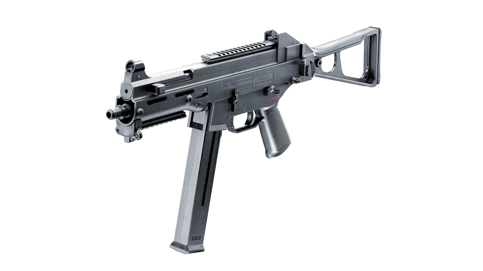 Sportsline-Ausführung der Heckler & Koch-Maschinenpistole. Im Original in den Kalibern 9 mm x 19, .40 S&W und .45 ACP, hier als 6-mm-Airsoft-Version mit Metall-Gearbox. Inklusive Akku und Ladegerät.